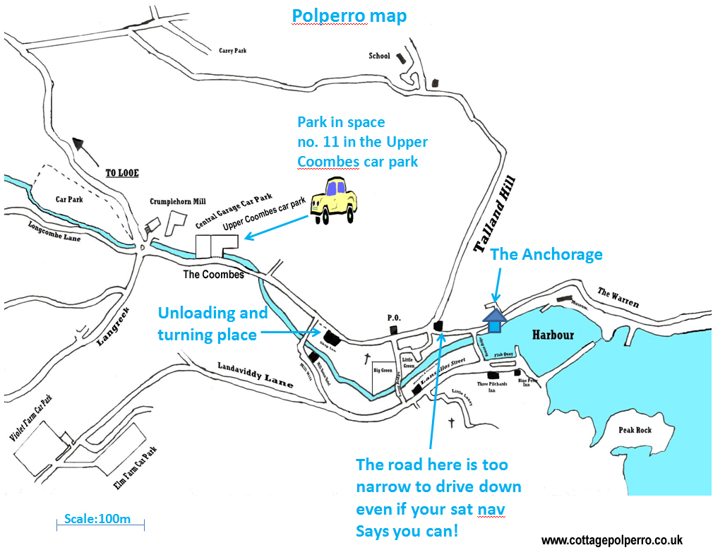 The Anchorage cottage is located in the traffic free Warren on the inner harbour wall in close proximity to the many eating and drinking hostelries. There are six pubs in the village and in excess of 25 eating establishments and a good variety of shops although some may be closed during the low season. Many of Polperro’s streets are too narrow for vehicle access so parking is in the Upper Coombes Garage – code for the safekey box is 2800.
